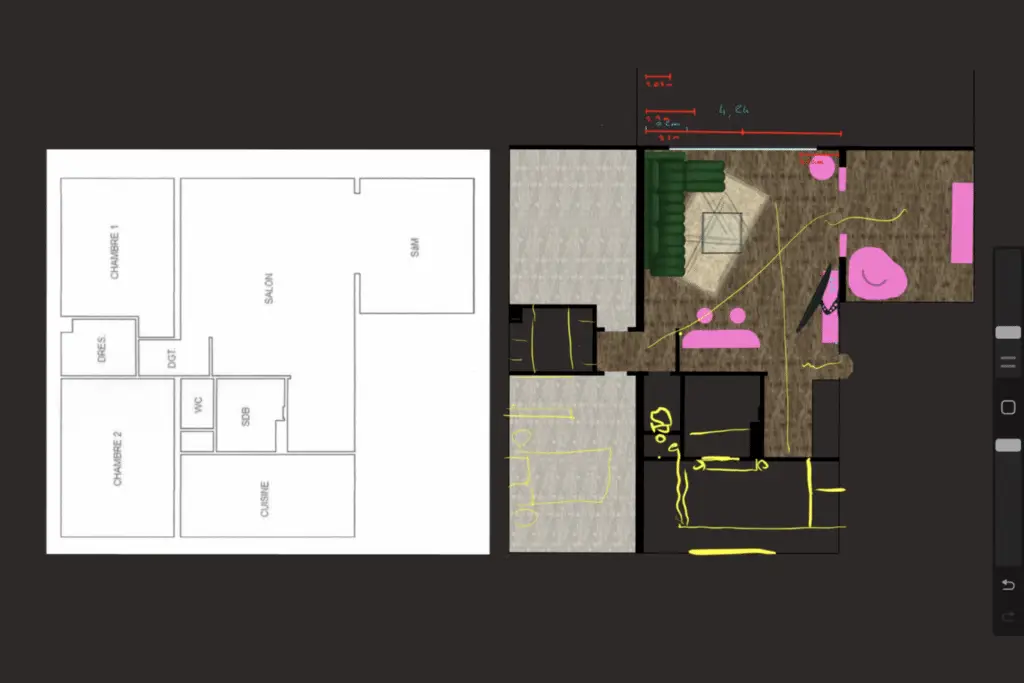 Processus : Après une visite de l’espace et une discussion sur les besoins, j’ai élaboré des propositions d’aménagement ou de décoration.