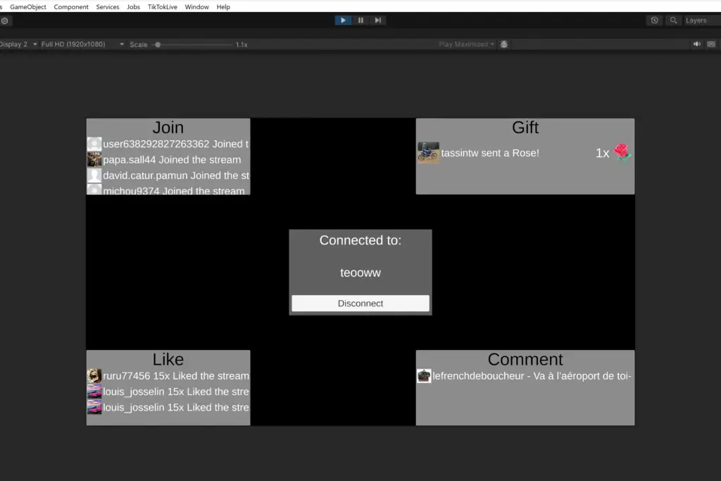 Avec votre aide, j’ai intégré l’API TikTok Live à mon projet Unity, en utilisant la bibliothèque TikTokLiveSharp. Cette intégration a permis de récupérer en temps réel les messages, les likes et les cadeaux envoyés par les spectateurs.