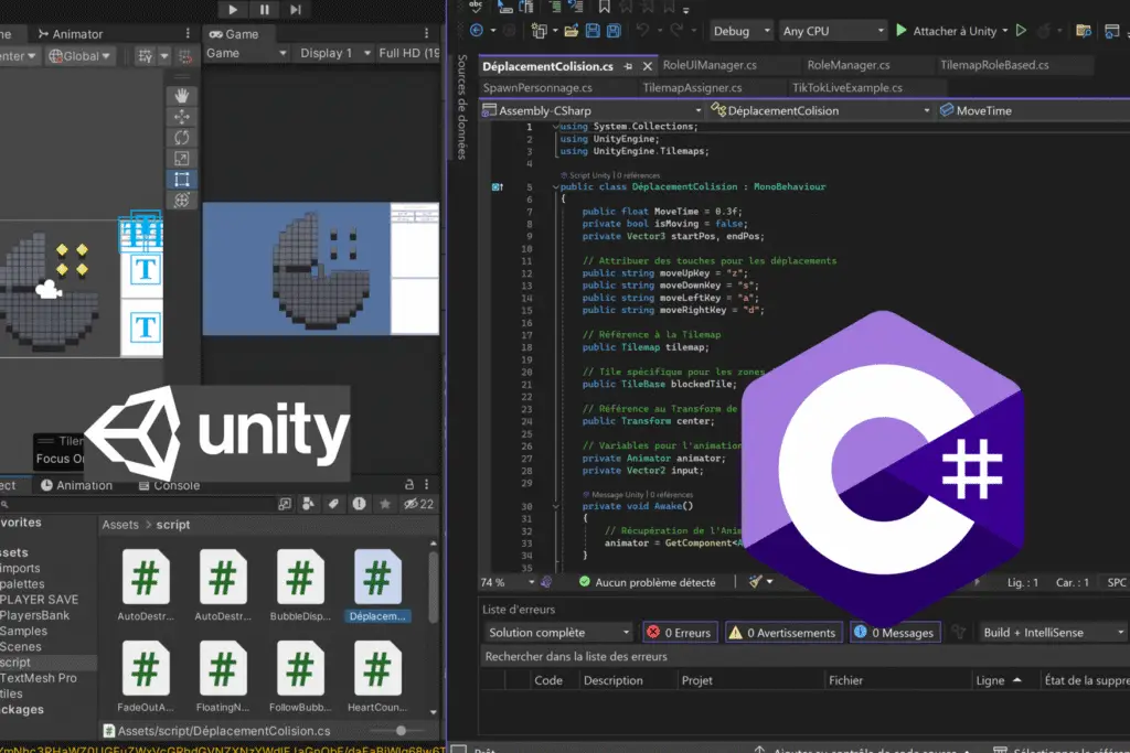 J’ai opté pour Unity, associé au langage C#, afin de développer une version plus aboutie des jeux interactifs. Cette transition m’a permis d’acquérir de nouvelles compétences en programmation et de structurer le projet de manière plus professionnelle